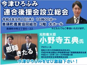 今津ひろふみ剣淵町後援会を設立頂きました。 36歳で剣淵町副議長の大澤秀明さんが後援会長をお引受け下さいました。 御祖父様の大澤秀了元剣淵町長には、議員秘書かけだしの時期に大変なご指導頂いたご縁があります。 着物姿の奥様 […]