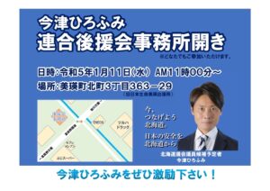 今津ひろふみ連合後援会事務所開きを下記のとおり執り行います。是非お誘い合わせのうえ、多数のご参加をお待ちしております! 日時:令和5年1月11日(水)午前11時~場所:美瑛町北町3丁目363ー29(旧日本生命美瑛出張所、 […]